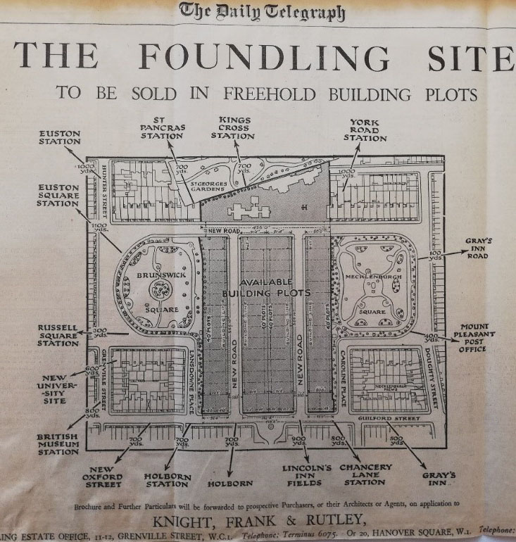 [31] ‘The Governors, doubtless with a true sense of their guardianship, have sold the site for a commercially satisfactory sum. What becomes of the stately old place does not concern them – its memories have been resolutely put behind, and they take their departure with the comfortable assurance that their charges will be fully equipped for a physically healthy and an efficient future. Will the speculative builder do his best or his worst…?’ Anne Page, The Foundling Hospital and its Neighbourhood, published by the Foundling Estate Protection Association, 1929, 28-29.